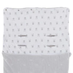 Nid d’ange P’tit bisou en fausse fourrure toute douce en coloris gris. Cette pièce, qui est un joli sac de couchage pour tout petit bébé, est très chaude car doublée de jersey blanc avec son imprimé « petites têtes de lapins » en gris et en plus elle est doublée de ouate. Cet accessoire est très affectif et ludique avec sa capuche en forme pointue d’où dépassent 2 oreilles de lapins qui font référence à notre mascotte du thème ! Cette capuche, qui maintiendra la tête de bébé bien au chaud, peut être ouverte par les pressions pour avoir une forme plus plate. La fonctionnalité n’est pas omise avec son ouverture quasi totale par un zip côté qui permet d’ouvrir entièrement bébé sans trop le manipuler et le mettre à l’intérieur.