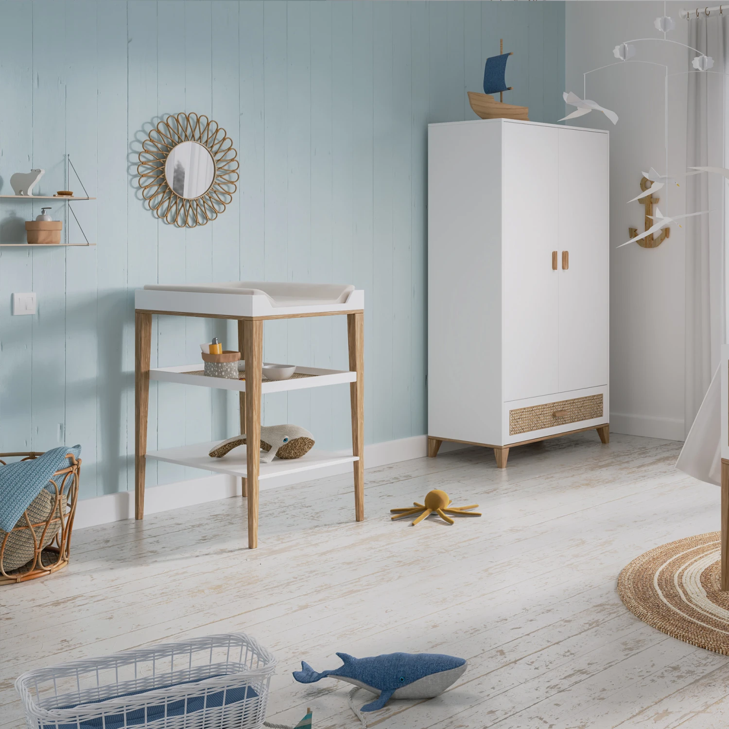 Assortie au reste de la chambre Nami, cette ravissante table à langer possède deux étagères sous le plateau. Les montants sont en bois massif, et les planches et le plan à langer en MDF, avec un insert de cannage de rotin naturel sur la planche du haut. Son plan à langer accueille un matelas de 52 x 75 cm (non fourni).